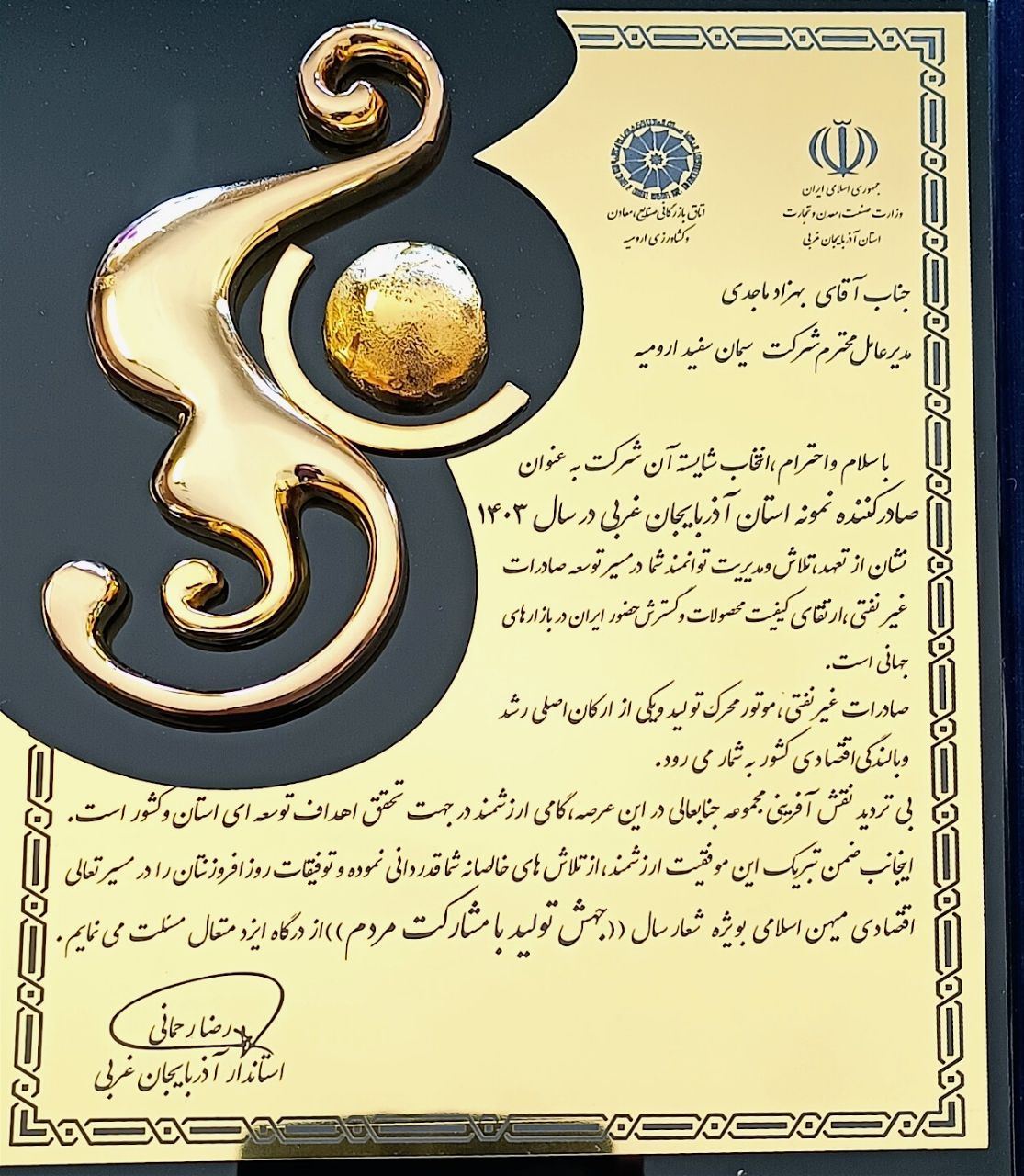 در تاریخ 1404/06/27 با حضور رئیس و اعضای کمیسیون اقتصادی مجلس، استاندار آذربایجانغربی و مسئولین اقتصادی استان، معاونین وزارت اقتصاد و دارایی، نمایندگان ارومیه در مجلس شواری اسلامی ، مشاور رئیسجمهور و فعالان اقتصادی و کارآفرینان استان در اتاق بازرگانی ارومیه برگزار گردید شرکت سیمان سفید ارومیه به عنوان صادرکننده نمونه استان آذربایجان غربی در سال 1403 انتخاب گردید.
